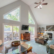 Soaring vaulted ceilings, warm natural light, and river views define this inviting great room. Perfect for quiet mornings or gatherings with family, it seamlessly connects indoor comfort with the beauty of the outdoors.