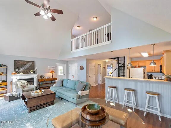 Perched above the living room, the loft offers a cozy, elevated hideaway with sweeping views of the river and great room below.