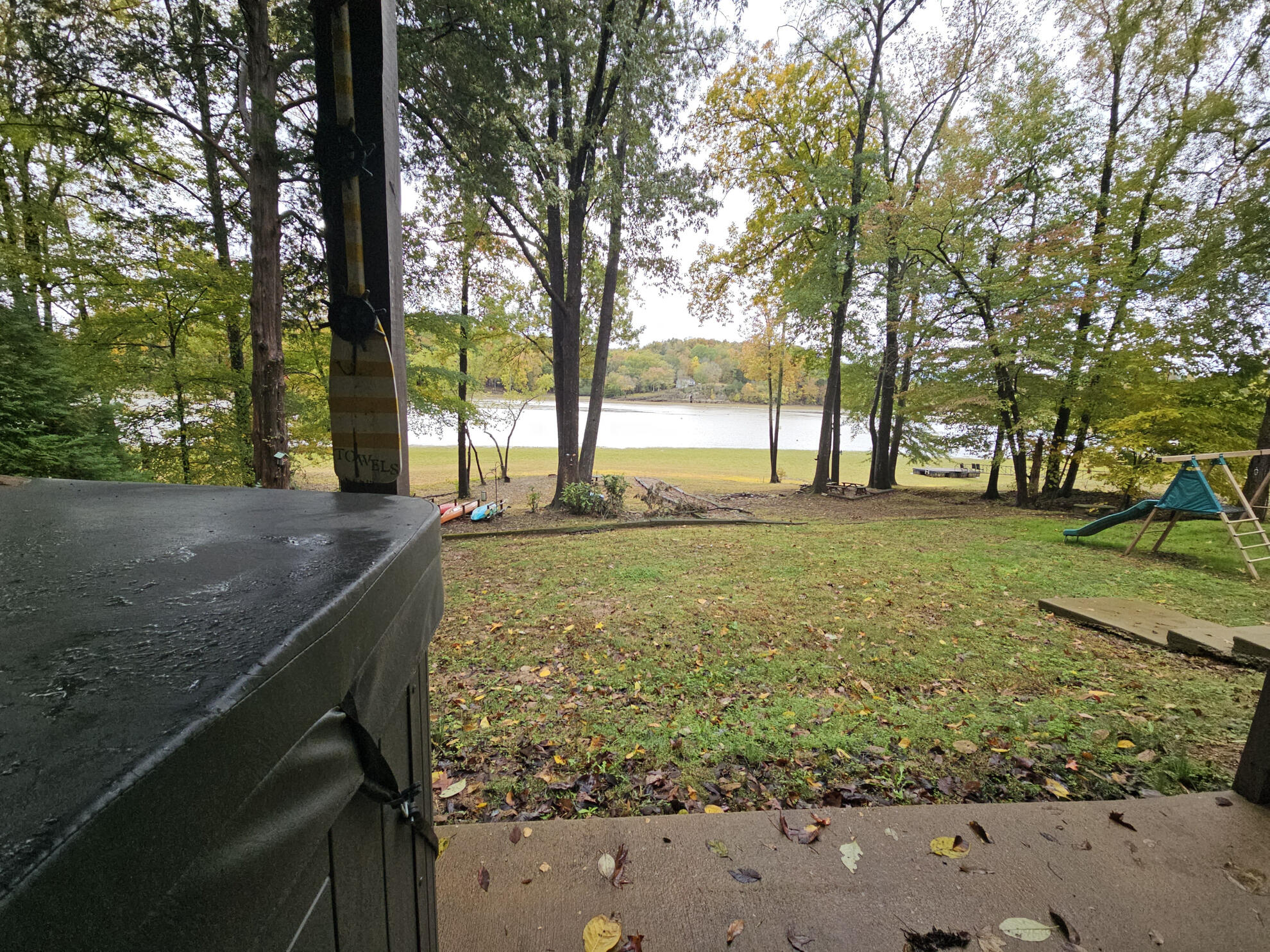 A gentle slope leads to the riverbank, where your private dock permit awaits — perfect for kayaks, fishing, or quiet reflection.