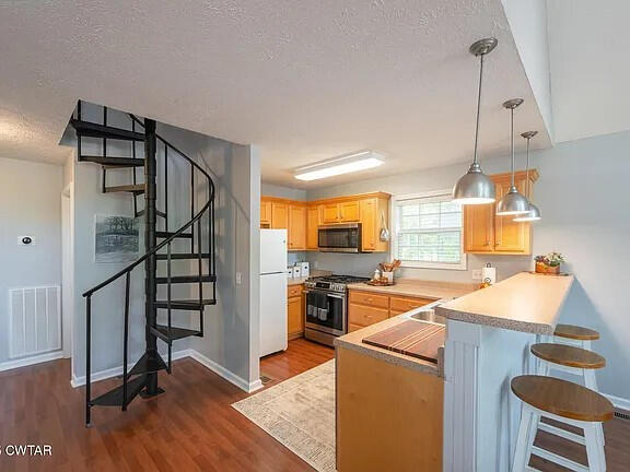 The kitchen blends warmth and efficiency, with a breakfast bar for easy mornings and pendant lighting for evening gatherings.